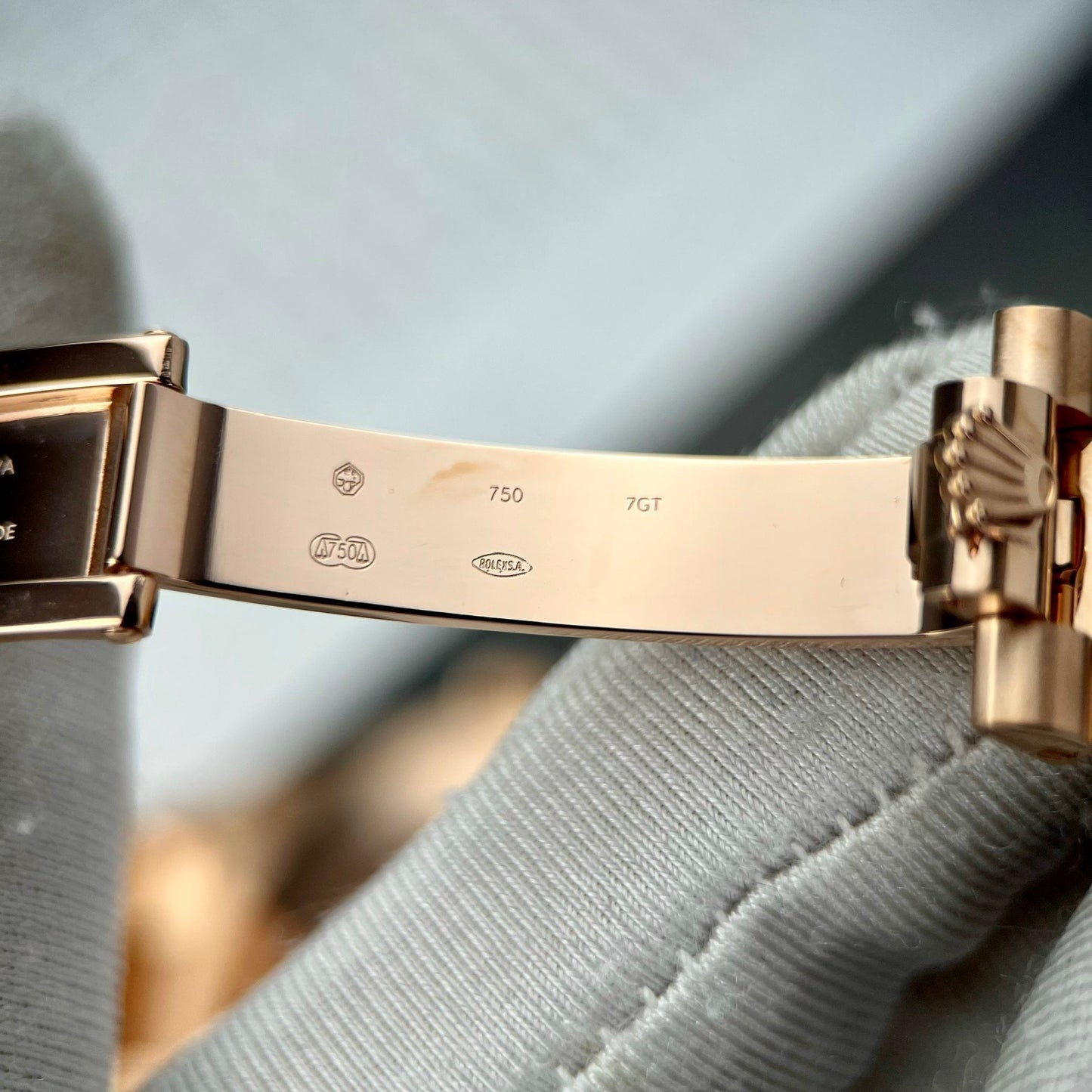 Material: acero 904L tanto para Cassa como para banda recubierta de Oro Rosa 18k