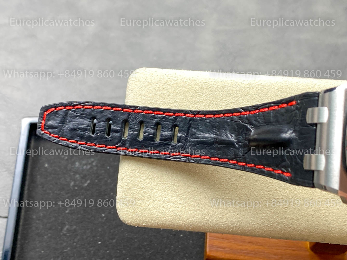 El reloj se completa con un cinturino de piel de aligátor marrón cosido a mano y una hebilla de acero inoxidable, que combina deportividad y elegancia. El fondo de caja de vetro zafiro revela los detalles del movimiento de cronógrafo automático de réplica.