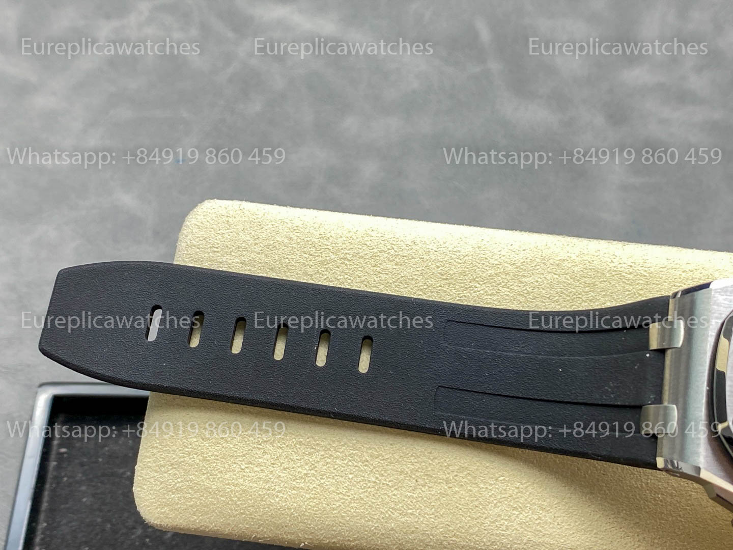 El reloj se complementa con un cinturón de piel de aligátor negra cosido a mano con costuras en azul intenso, rematado con una hebilla de acero inoxidable, que combina a la perfección con la audaz paleta de colores. Un fondo de caja de vetro zafiro completa el diseño, permitiendo ver el movimiento del cronógrafo automático de réplica.