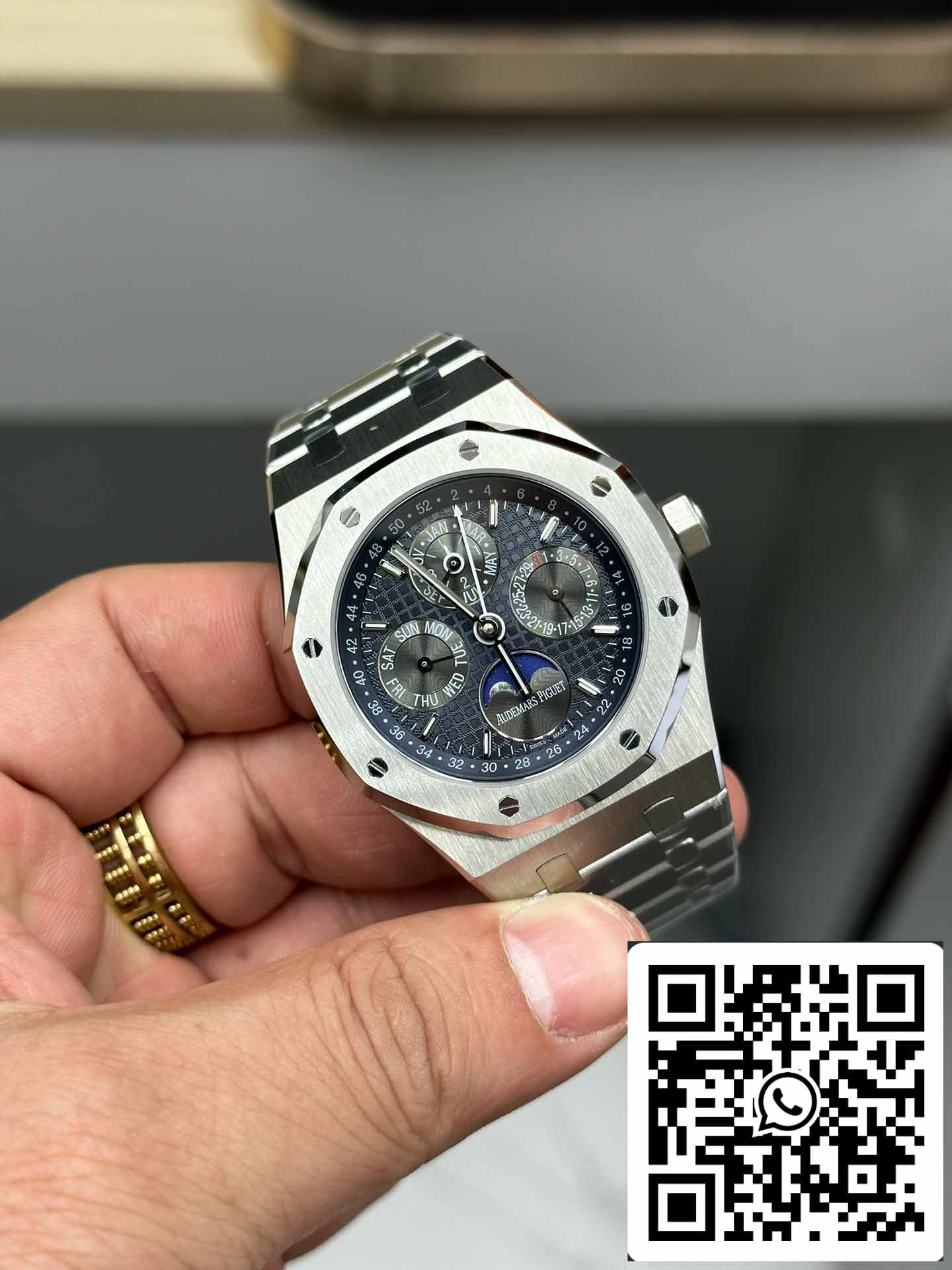 Noble watchmaking, Audemars Piguet Royal Oak series perpetual calendar wristwatch, with its noble and elegant quadrante blu paired with a striking acciaio inossidabile Cassa, perfectly reflects Audemars Piguet's aesthetic design and the high technology of complex functions.