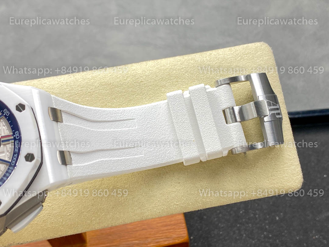 The Audemars Piguet Royal Oak Offshore 26402CB.OO.A010CA.01 from TK Fabbrica blends the Offshore’s bold chronograph DNA with a fresh white ceramic case and a clean, modern color palette. This 44 mm timepiece pairs luxury craftsmanship with a crisp, sporty style that stands out in any season.