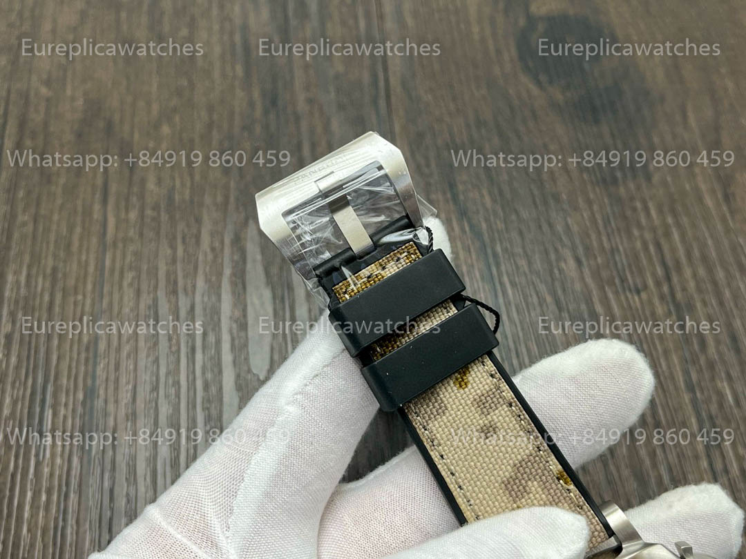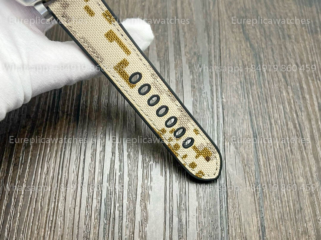 The PAM1513 pays tribute to the legendary Navy SEALs, blending Panerai's iconic design with military aesthetics. Featuring a 44mm Carbotech™ Cassa, this watch is lightweight yet extremely durable. The quadrante is decorated with desert camouflage-inspired elements, complemented by a rugged textile cinturino with camouflage print, evoking the battlefield spirit.