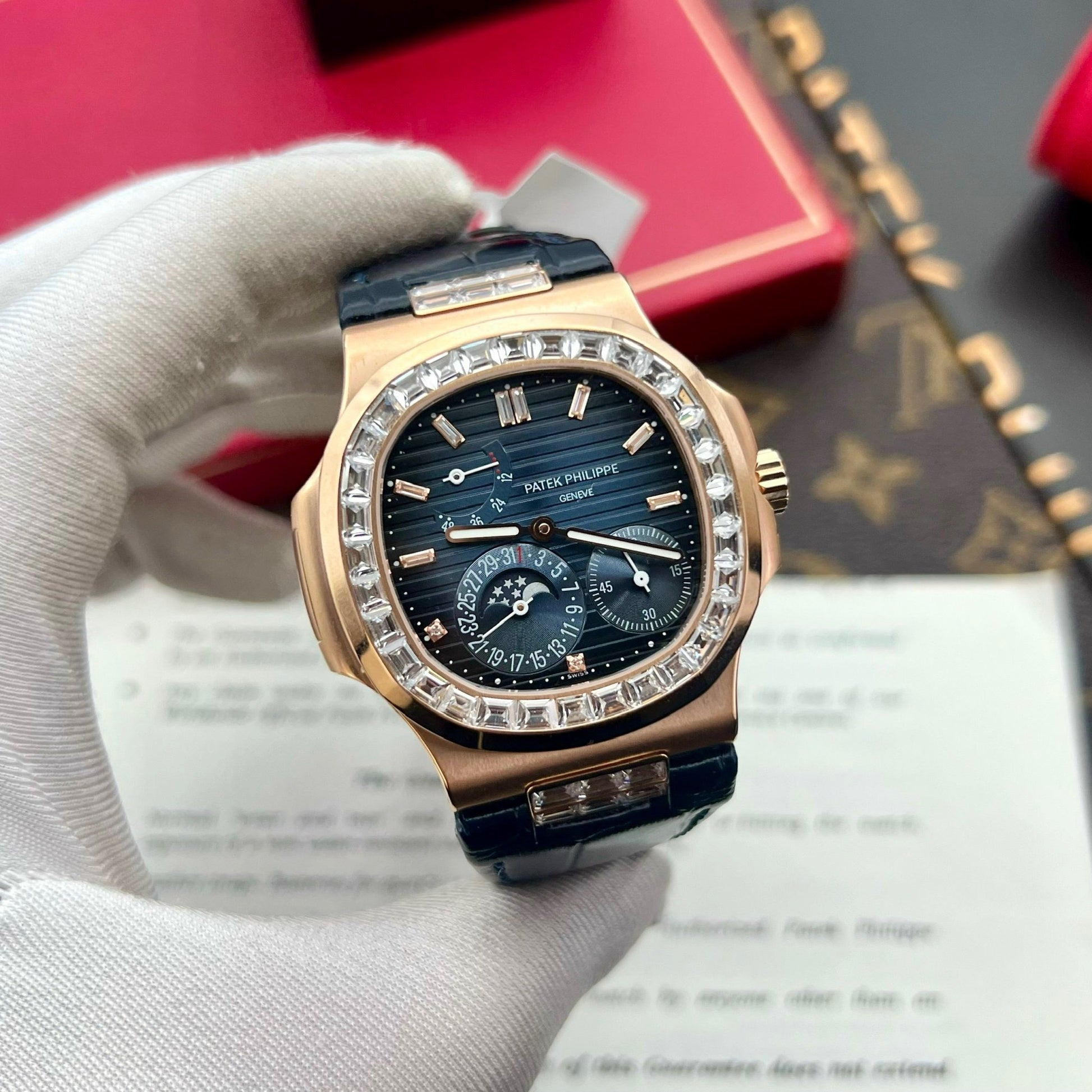 The customized Versione of the Patek Philippe 5724 series with 18k Oro plating, and moissanite diamonds throughout the watch, combined with a high-quality Pelle cinturino will make you more satisfied with the quality and finishing.
