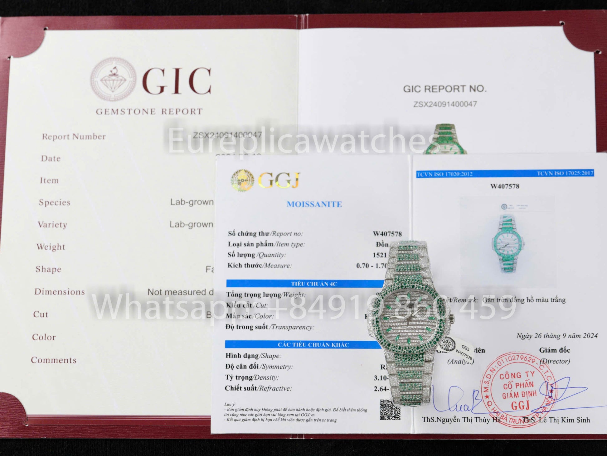 Experience luxury and elegance with the Patek Philippe Nautilus 7118 replica, a 1:1 high-quality reproduction of the iconic timepiece. This exquisite watch is fully adorned with premium moissanite stones, offering a dazzling brilliance that closely mimics real diamonds. The entire Cassa, lunetta, bracciale, and even the quadrante are meticulously set with these stunning stones, giving it an unparalleled shine.