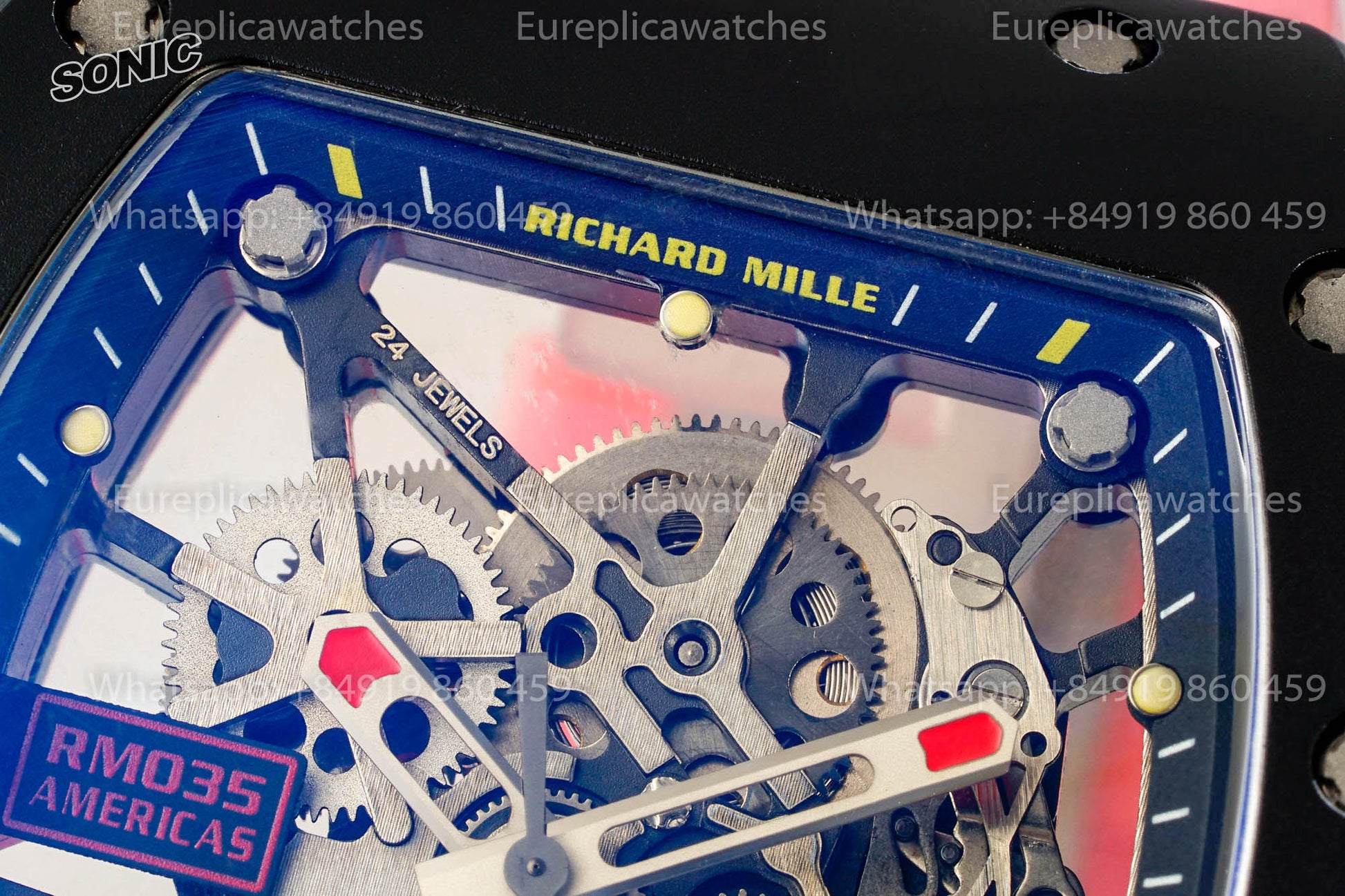 Dial: Skeletonized with blue inner structure, “RM 035 Americas” logo
