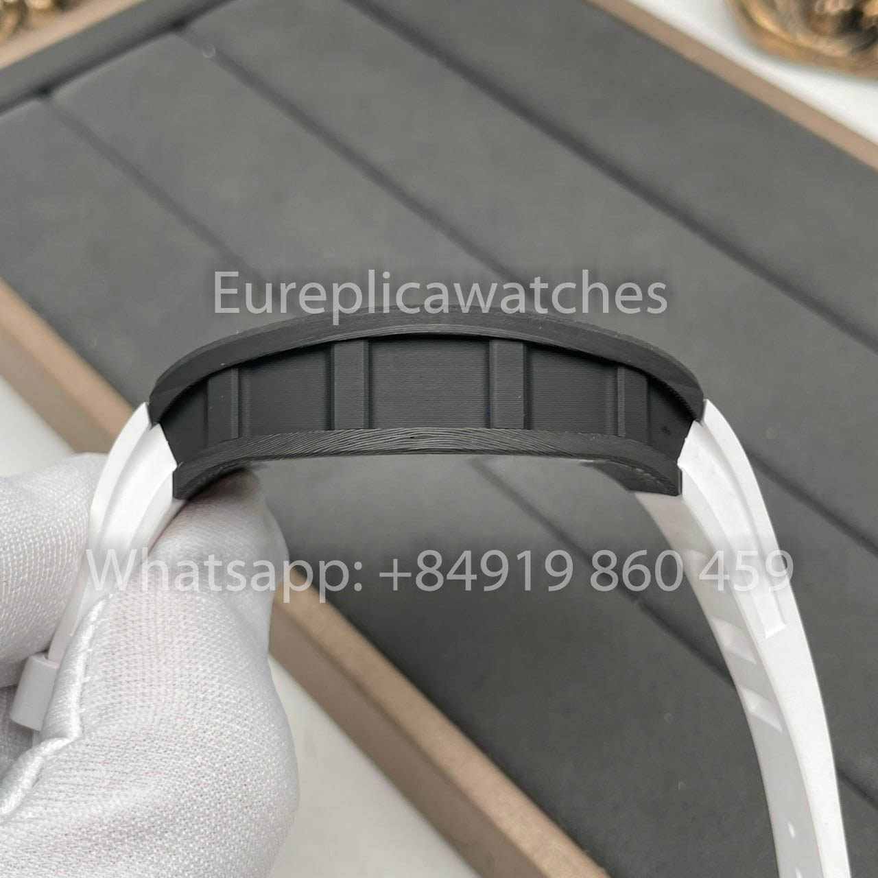Richard Mille RM055 Global edizione limitata Watch features a tonneau-shaped case, crafted with a three-part structure. The upper and lower bezels and caseband are made from NTPT carbon fiber and sandblasted Grade 5 titanium, respectively. The 49.90mm x 42.70mm NTPT carbon fiber case is formed by a special automated control system and interwoven with custom resin fibers. Both front and rear crystals use sapphire cutting technology. The watch boasts comfort, lightness, and durability, powered by the new integrated Caliber RMUL2 manual winding movimento, constructed from Grade 5 titanium, with PVD coating and Titalyt-treated baseplate and bridges, ensuring optimal structural rigidity, smooth surface finish, and perfect gear system operation. It also features an adjustable winding barrel, shock resistance, and various other functions, achieving exceptional accuracy and stability. (All gears operate like the authentic version.) Some parts are interchangeable with genuine components.