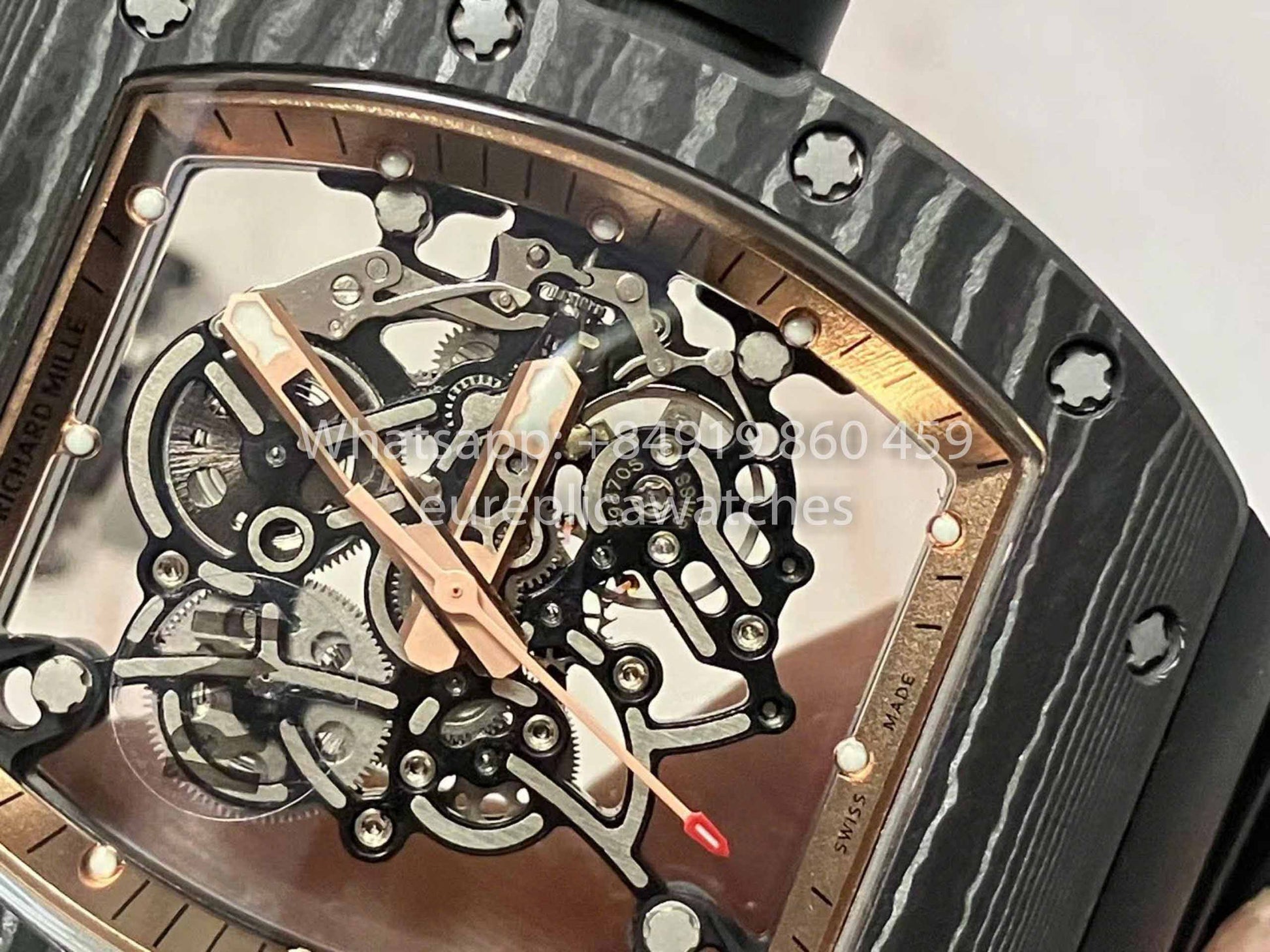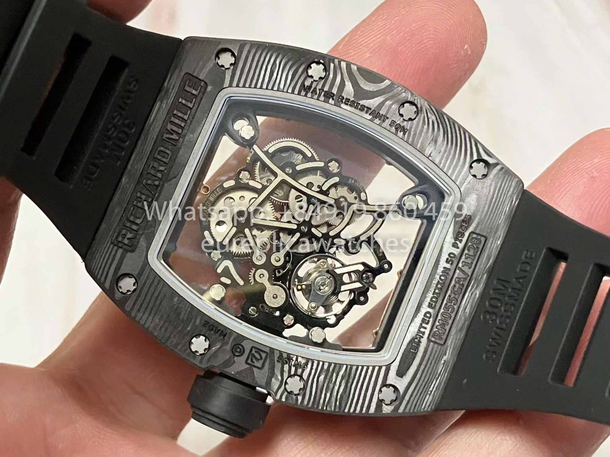 Richard Mille RM055 Global edizione limitata Watch features a tonneau-shaped case, crafted with a three-part structure. The upper and lower bezels and caseband are made from NTPT carbon fiber and sandblasted Grade 5 titanium, respectively. The 49.90mm x 42.70mm NTPT carbon fiber case is formed by a special automated control system and interwoven with custom resin fibers. Both front and rear crystals use sapphire cutting technology. The watch boasts comfort, lightness, and durability, powered by the new integrated Caliber RMUL2 manual winding movimento, constructed from Grade 5 titanium, with PVD coating and Titalyt-treated baseplate and bridges, ensuring optimal structural rigidity, smooth surface finish, and perfect gear system operation. It also features an adjustable winding barrel, shock resistance, and various other functions, achieving exceptional accuracy and stability. (All gears operate like the authentic version.) Some parts are interchangeable with genuine components.