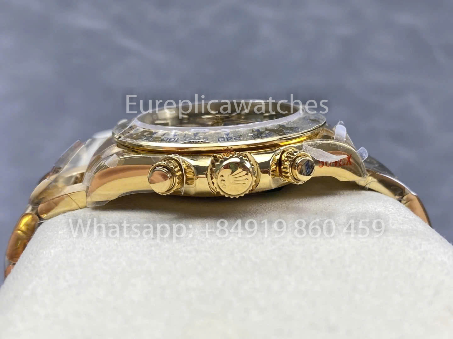 QF Fabbrica proudly presents the 2025 release of the Rolex Cosmograph Daytona Super Clone, powered by the latest Asian 4131 movimento, offering an impeccable 1:1 replication of the genuine model. Designed with attention to detail, the case and bracciale are constructed from solid 904L acciaio inossidabile, featuring gold plating with Cu-W alloy counterweight to perfectly match the weight and feel of real gold models.