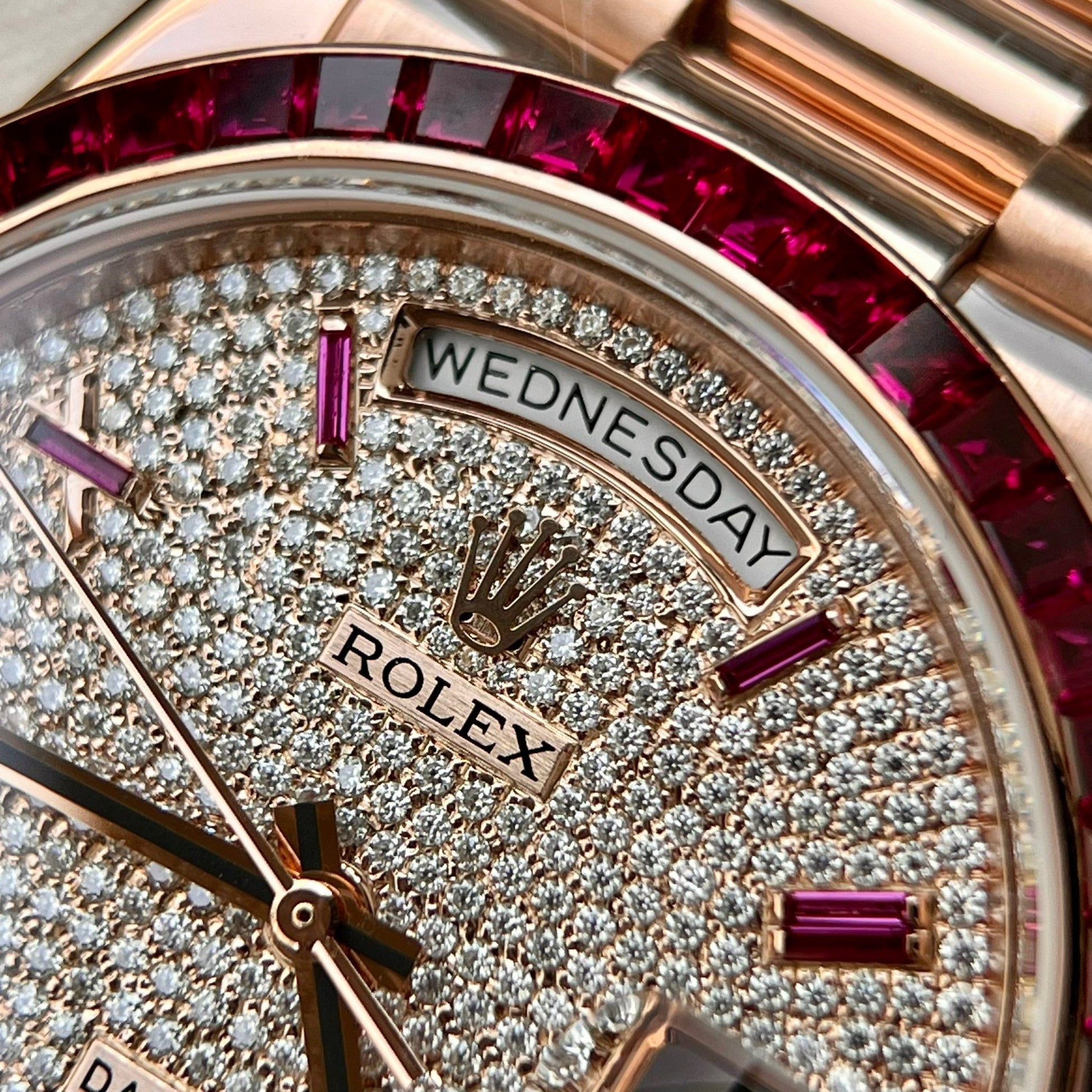 Rolex Day Date 228398 DRRP 1:1 edizione migliore Custom Rosa Oro 18k and ruby saphire Diamond Pave