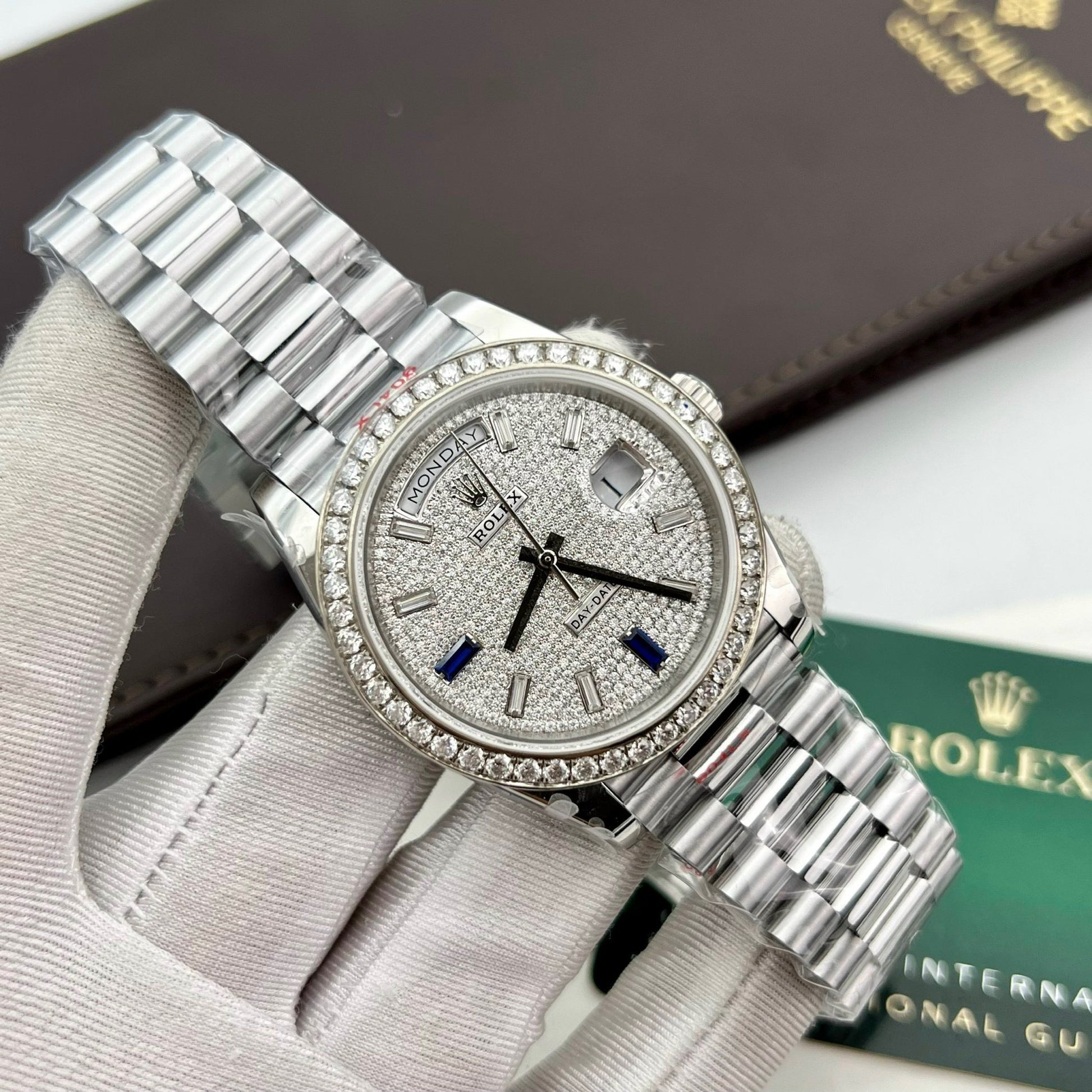 This is a customized Versione of the Rolex day date Versione from the GM Fabbrica with the V3 Versione weighing 180grams with a lunetta set with moissanite diamonds, instead of cheap swarovski stones. This makes the watch face as bright and beautiful as a diamond, of course the price will also be higher than the regular versions.