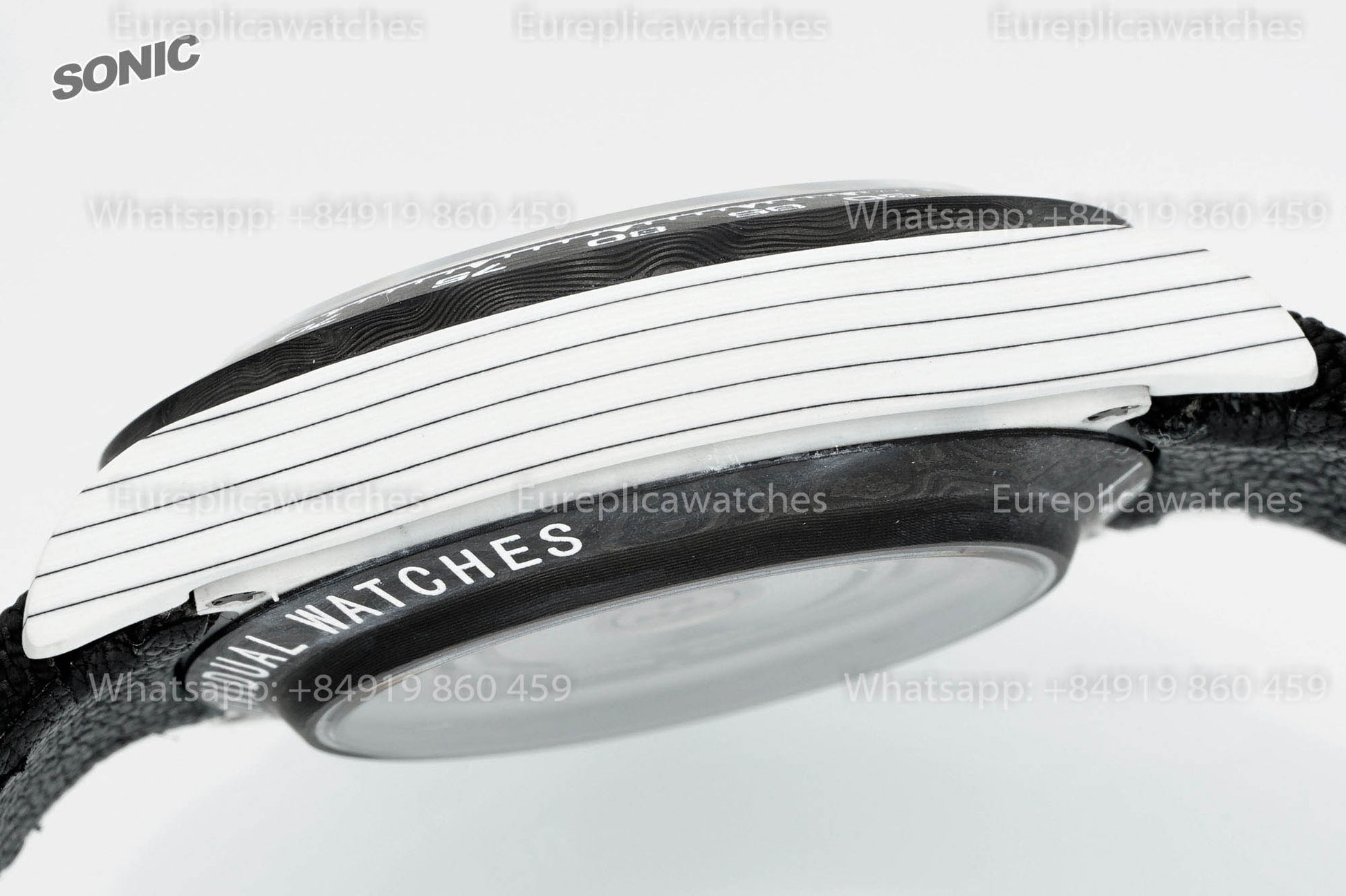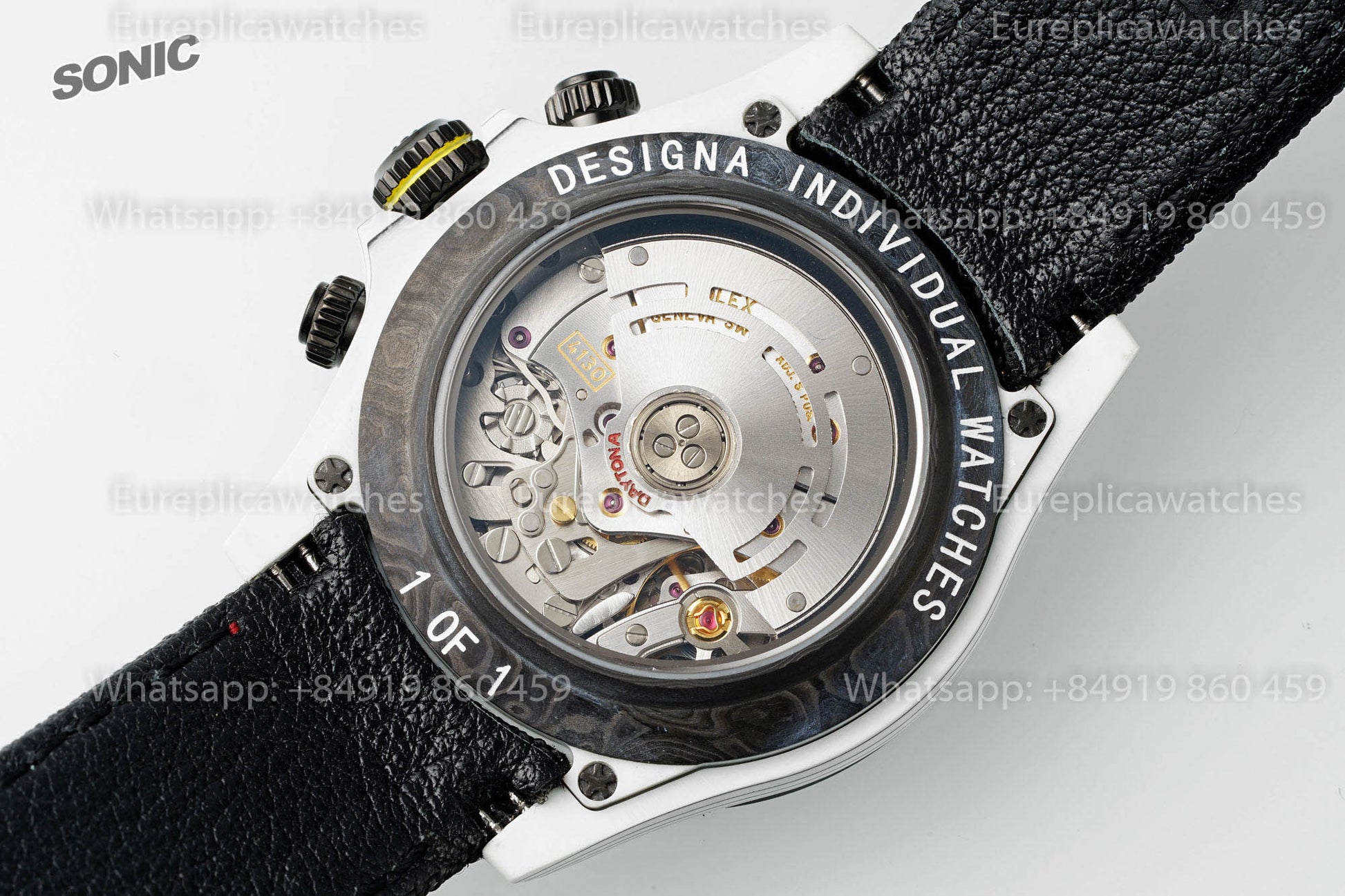 DiW is a renowned customization brand that has launched unique modified versions of the Rolex Daytona. This special Edizione incorporates design elements from the Ferrari 458 MM Speciale, blending automotive artistry with horology. With its Nero-and-Bianco forged Carbonio Cassa and lunetta, minimalist nylon cinturino, and lightweight engineering philosophy, the watch resonates with the spirit of the Ferrari 458 MM Speciale. Complemented by the skeletonized display back showcasing the replica 4130 movimento, it is a true fusion of performance and exclusivity.