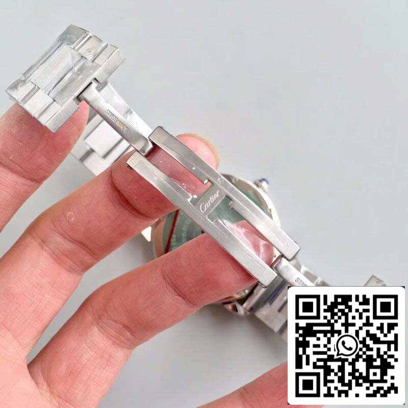 Originário da época de Louis Cartier , o Ronde de Cartier é definido por algarismos romanos, ponteiros azuis em forma de espada e um cabochão de safira.